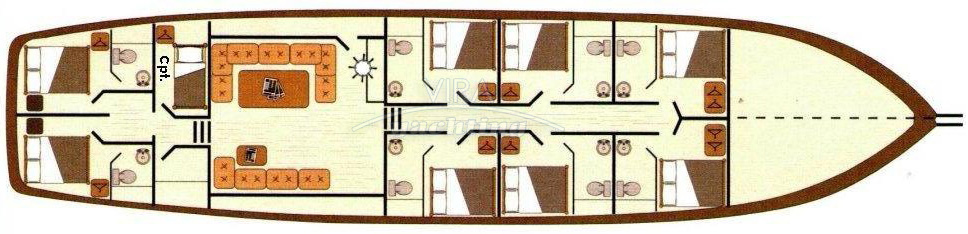 | Unterbringung | • Für max. 16 Gäste in 8 Kabinen (alle mit separatem Bad) Alle 8 Kabinen mit Doppelbett Bäder mit Waschbecken, offener Dusche, WC mit elektrischer Vakuum-Spülung • Salon mit Essbereich und Bar • Separate Crewkabinen |