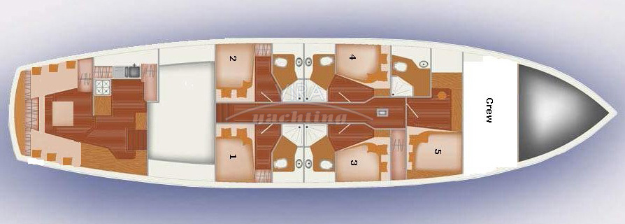 | Decksbereiche | Sitz-/Essbereich mittschiffs, Sonnenmatratzen auf dem Kabinenaufbau Entspannungssessel auf dem Achterdeck, Cocktail-Sitzgruppe auf dem Vordeck |