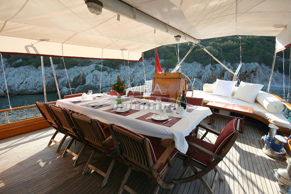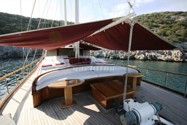 | Decksbereiche | Essbereich und Außen-Bar auf dem Achterdeck, gepolstertes Rundsofa am Heck, Sonnenmatratzen auf dem Kabinenaufbau, Cocktail-Sitzgruppe auf dem Vordeck |