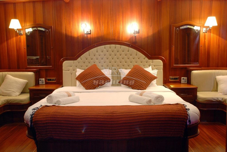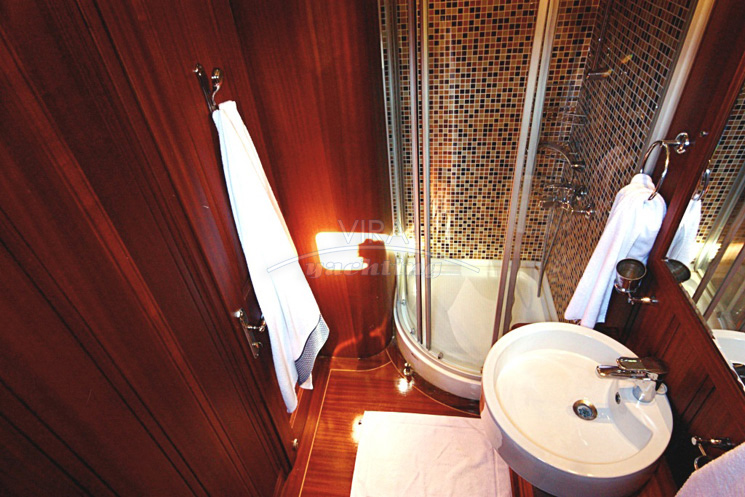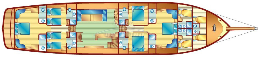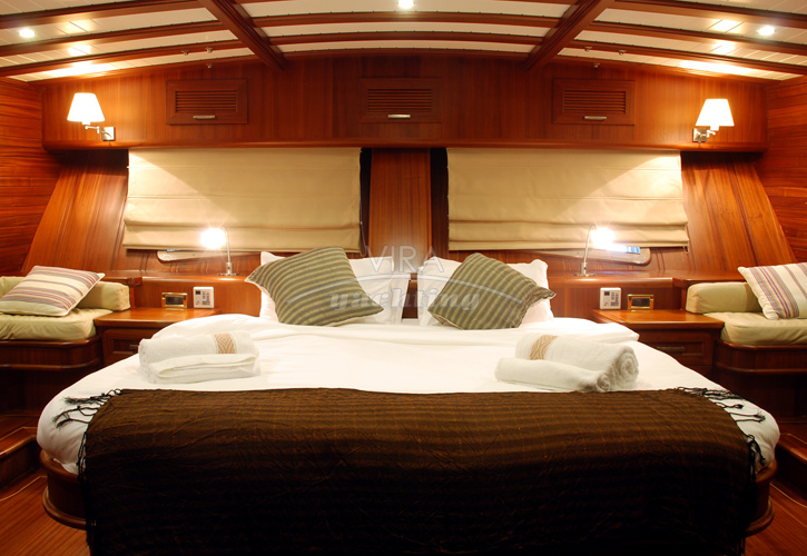 | Unterbringung | • Für max. 12 Gäste in 6 Kabinen (alle mit separatem Bad) 1 Masterkabine (volle Schiffsbreite hinten) mit Kingsize-Doppelbett und Sofa 1 Masterkabine (volle Schiffsbreite vorne) mit Kingsize-Doppelbett und Sofa 2 Kabinen mit Doppelbett 2 Kabinen mit je 2 Einzelbetten Bäder mit Waschbecken, Duschkabine und WC mit elektrischer electrical Vakuum-Spülung (beide Masterkabinen verfügen über je 2 separate Bäder, davon 1 mit Duschkabine und 1 mit WC) • Salon mit Essbereich und Bar • Separate Crewkabinen |