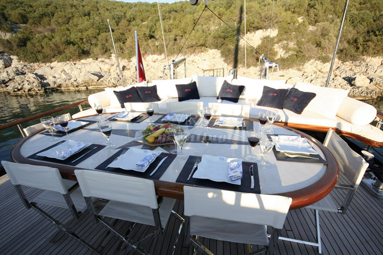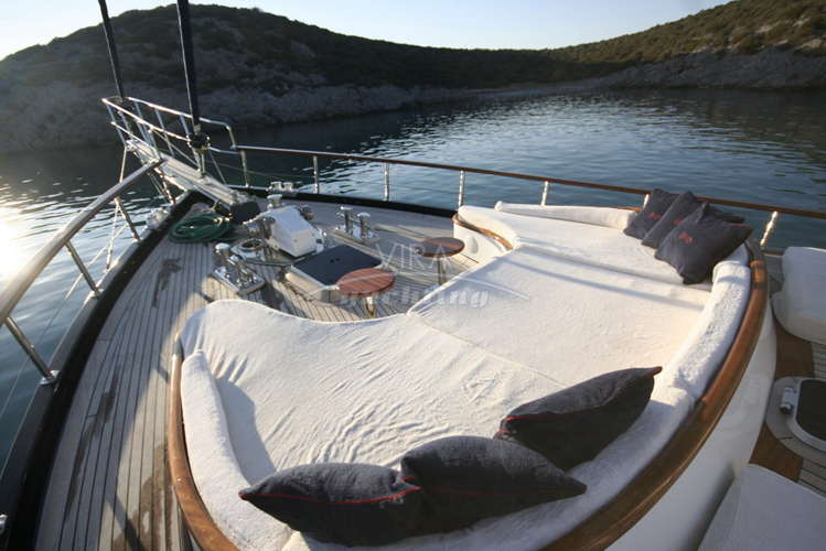 | Decksbereiche | Essbereich auf dem Achterdeck, gepolstertes Rundsofa am Heck, Sonnenmatratzen auf dem Kabinenaufbau, Cocktail-Sitzgruppe auf dem Vordeck |