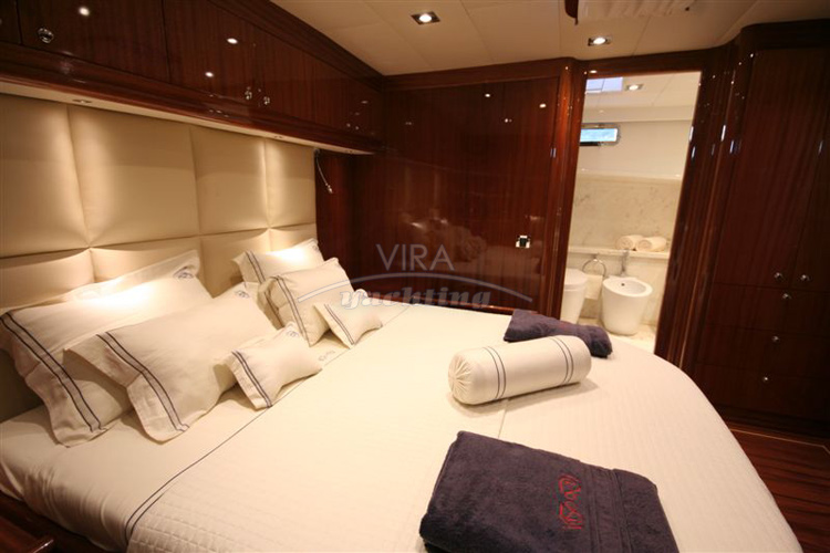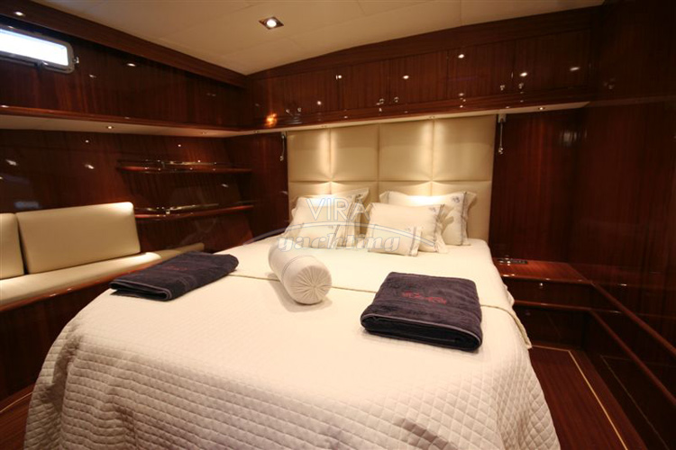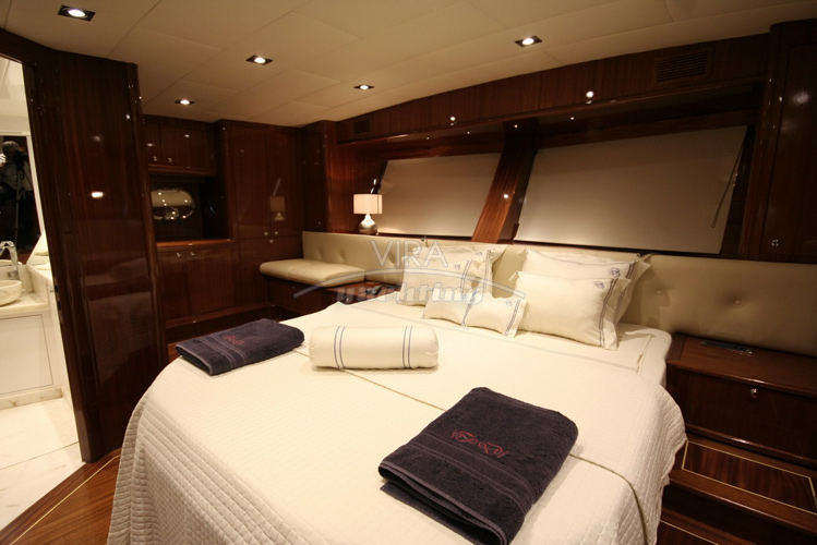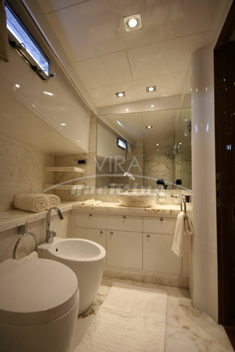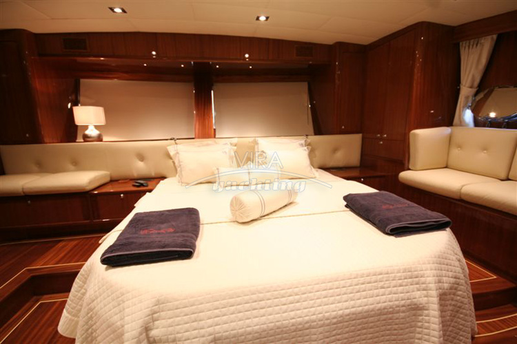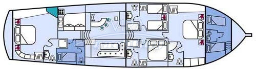 | Unterbringung | • Für max. 8 Gäste in 4 Kabinen (alle mit separatem Bad) 1 Masterkabine (volle Schiffsbreite hinten) mit Kingsize-Doppelbett und Sofa 1 Masterkabine (volle Schiffsbreite vorne) mit Kingsize-Doppelbett und Sofa 1 Kabine mit Doppelbett 1 Kabinen mit 2 Einzelbetten Bäder mit Waschbecken, Duschkabine und Spül-WC (Masterkabinen zusätzlich mit Bidet) • Salon mit Essbereich und Bar • Separate Crewkabinen |