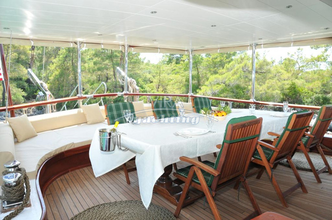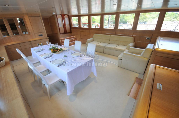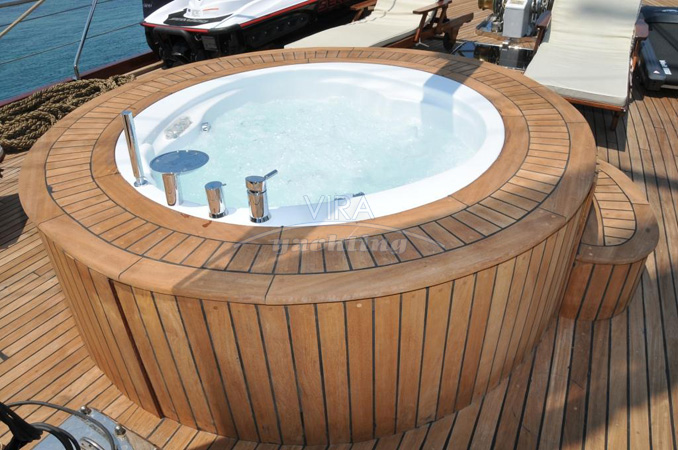 | Decksbereiche | 2 große Essbereiche (einer auf dem Achterdeck und einer auf dem Vordeck), Außen-Bar auf dem Achterdeck, gepolstertes Rundsofa am Heck, Sonnenmatratzen auf dem Kabinenaufbau, Liegestühle, Whirlpool und Laufband auf dem Vordeck |