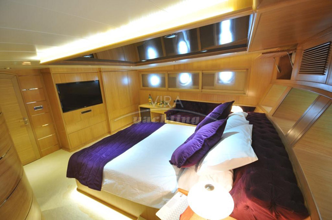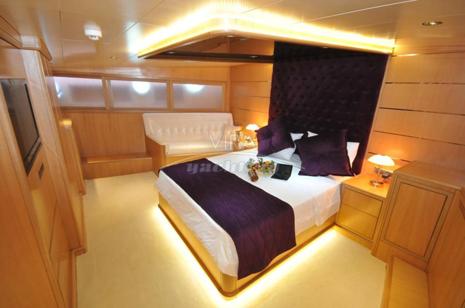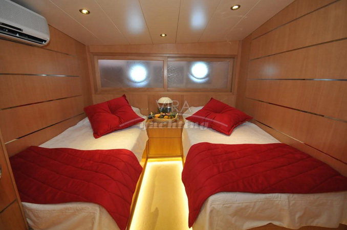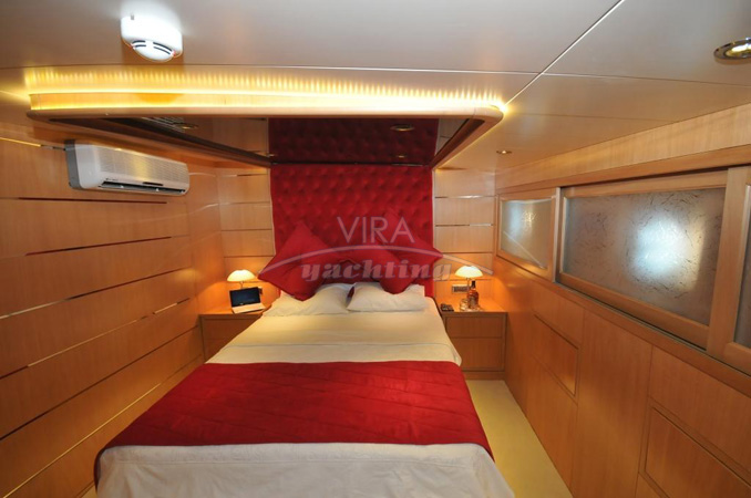 • Für max. 10-12 Gäste in 5-6 Kabinen (alle mit separatem Bad) 1 Masterkabine (volle Schiffsbreite hinten) mit Kingsize-Doppelbett, Sofa und Minibar 1 Masterkabine (volle Schiffsbreite vorne) mit Kingsize-Doppelbett, Sofa und Minibar 1 Junior-Masterkabine mit Queensize-Doppelbett und Minibar 1 Kabine mit Doppelbett 1 Kabine mit 2 Einzelbetten   Zusätzlich für Gruppen von 11-12 Personen: 1 Kapitänskabine mit schmalem Doppelbett Bäder der Gästekabinen mit Waschbecken, Duschkabine und Spül-WC, Bad der Kapitänskabine mit offener Dusche • Eleganter Salon mit Essbereich und Sofa • Separate Crewkabinen |